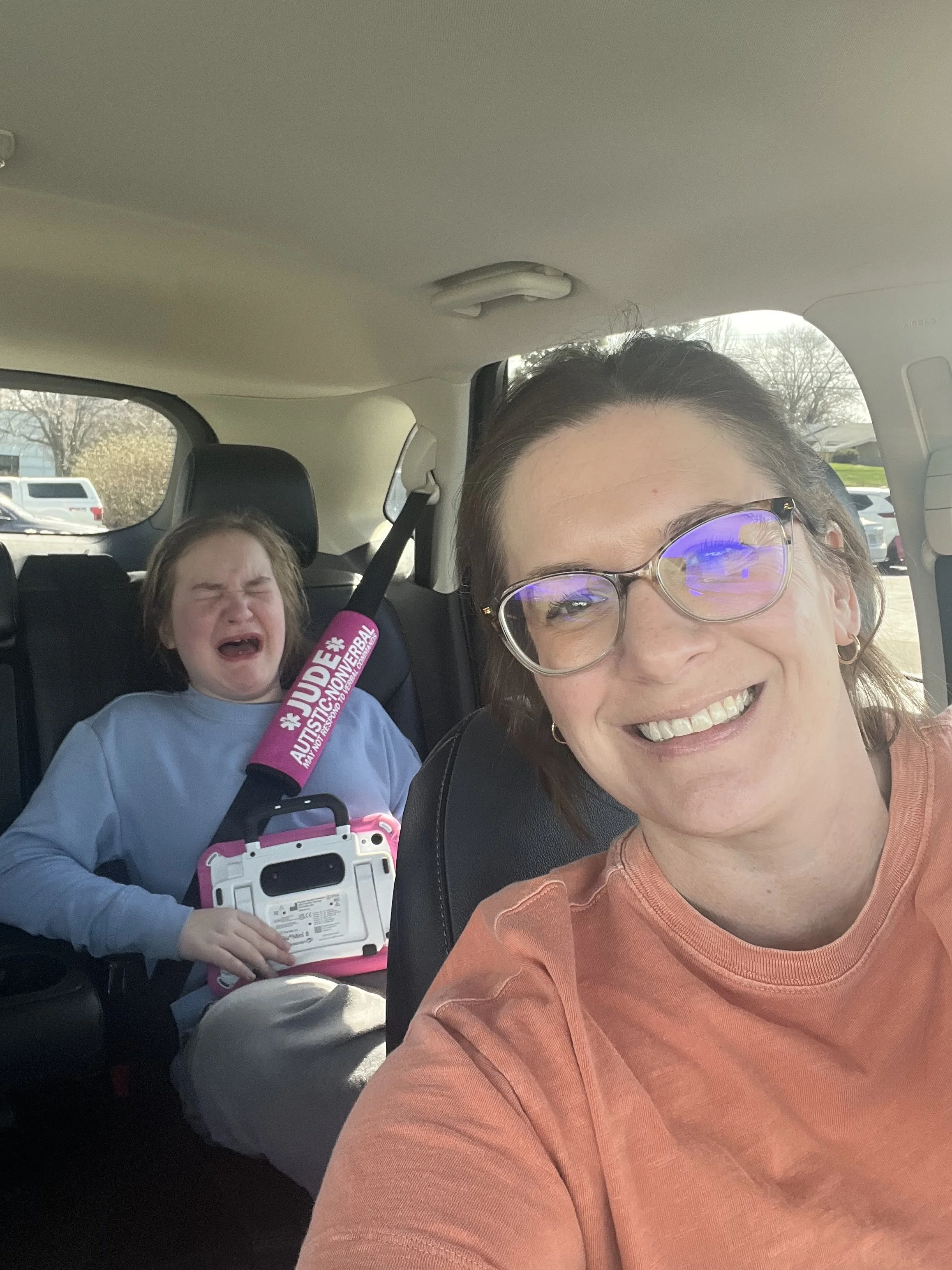For some reason she was in a bad mood all week. She was extremely particular and overstimulated. She was also tired because her sleep schedule was hit and miss. Megan even sent me this picture on the way to speech therapy.